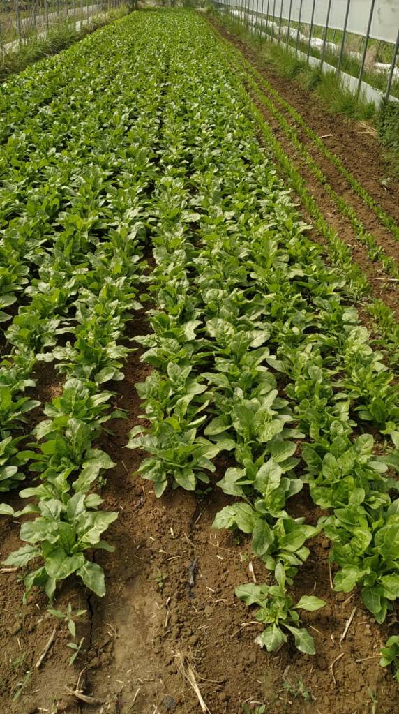 Forse può essere interessante sapere che cosa facciamo in questo periodo dell’anno. Dall’inizio gennaio abbiamo già effettuato qualche trapianto. Noi semina sotto serra non la effettuiamo praticamente mai perché ci facciamo i piantini internamente quindi diciamo che riusciamo a ridurre un po’ i costi rispetto all’acquisto di piantini tramite vivaista. Quindi trapiantiamo anche robe che certe persone non si sognerebbero mai di fare per esempio gli spinaci, la valeriana. Perché lo facciamo? Semplicemente perché per noi il trapianto ha diversi aspetti positivi: il primo aspetto è che comunque i semi soprattutto a inizio anno, con il freddo, li facciamo germinare dentro una cella di germinazione e quindi germinano in un tempo molto più breve rispetto a seminarli direttamente sotto serra perché la cella di germinazione ha il giusto grado di umidità, la giusta temperatura che oltrepassa i 20°. Capiamo bene che un seme seminato a inizi gennaio sotto una serra non riscaldata -perché noi le serre non le riscaldiamo- di sicuro ha dei tempi molto più lunghi per poter emergere. Poi una volta emersi e germinati i semi vengono messi sotto un’altra serra del vivaio. Poi a piantare direttamente queste cose sotto serra diciamo che i piantini si avvantaggiano rispetto all’erba perché il terreno viene lavorato, fresato, il terreno è pronto per essere trapiantato, per assurdo uno può vederla come due macchine che fanno a gara: da una parte c’è il piantino che parte praticamente 10 giorni prima rispetto all’erba la quale, quindi, parte teoricamente in svantaggio. Poi soprattutto noi lo spinacio tendiamo metterlo anche non troppo ravvicinato, a far crescere bene la pianta, perché abbiamo visto che alla fine lo spinacio trapiantato comunque dal punto di vista economico non è così conveniente raccogliere lo spinacio troppo piccolo perché obiettivamente lì c’è un costo in più che è quello del terriccio e i costi della manodopera, che su una roba seminata direttamente non hai. Quindi tendiamo a farlo diventare un po’ più grosso anche per una questione economica, ma poi soprattutto perché abbiamo visto che rimane un prodotto più facile da pulire, rimane tenero, non diventa coriaceo sotto i denti. Stesso discorso la valeriana. Da tanti anni vogliamo provare a fare… vendono quei nastri, come un velo da sposa, un tessuto non tessuto con dei semi di valeriana già seminati all’interno. Uno stende questo tessuto sul terreno, gli mette uno strato di sabbia sopra e in teoria la pianta cresce da lì e con questo telo si contrasta leggermente l’erba però è una roba che non ci siamo ancora messi per farlo perché comunque dipendi da ditte esterna: è un processo complicato attaccare il seme a un nastro, è un lavoro che ti fanno e se lo fanno anche pagare abbastanza bene quindi al momento risulta ancora più economico per noi fare il piantino di valeriana. Più o meno i vantaggi sono gli stessi degli spinaci quindi il fatto di svilupparsi prima rispetto all’erba viene sicuramente messo a un sesto di impianto più fitto rispetto agli spinaci. Sia la valeriana che gli spinaci sono fatti in questo modo perché – è sempre bene ricordarlo – noi facendo agricoltura bio non abbiamo la possibilità di diserbare in nessun modo. Tendenzialmente o sei molto bravo a seminare nel momento giusto perché nella semina diretta molte volte si rende necessario un diserbo nel momento in cui l’erba tende un po’ a contrastare l’emergenza delle piante. La valeriana è una coltura abbastanza impegnativa, nel senso che la parte che incide di più è il discorso della raccolta perché la valeriana pesa poco, c’è poco da fare. Poi dipende molto dal grado di umidità nel periodo in cui si mette: ci sono delle volte in cui la valeriana tende ad avere rovinate o ingiallite le foglie più basse e lì la raccolta diventa ancora più laboriosa nel senso che se da un cespo di Valeriana di 10 g devi ancora togliere 2-3 foglie minuscole la raccolta della valeriana diventa molto dispendiosa in termini di tempo. La valeriana fatta in corta gamma, dove viene seminato su delle tavole da biliardo meccanicamente, raccolta meccanicamente con dei veri e propri nastri trasportatori e prodotti quintali, quintali e quintali, messe poi nelle classiche buste già lavate, sono sicuramente altri metodi di lavorazione. Quelle piante lì, raccolte a macchina, non si possono permettere di avere nessun difetto, quindi parliamo di nessun insetto, nessuna pianta rovinata, nessun filo d’erba all’interno e quindi va di per sé che devono sicuramente subire molti trattamenti per avere questa condizione di sviluppo perfetto. Questa è una roba che nel bio è quasi impossibile da fare.