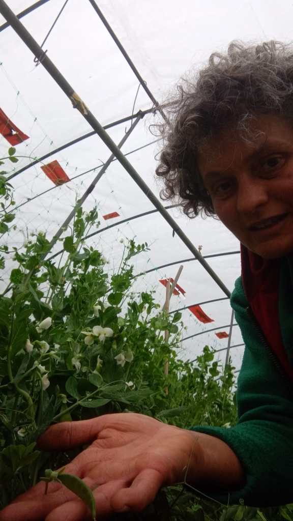“Queste taccole partono da seme – ci spiega Laura Nervo di Bra – seme biologico e sono state seminate a inizio febbraio. Generalmente mettevo sempre le taccole rampicanti, quindi bisognava mettere la retina, quest’anno ho voluto provare a mettere queste taccole che sono nane con la speranza di non dover fare grossi lavori, mettere retine e tutto. In realtà, essendo sotto serra queste taccole sono diventate abbastanza alte e stanno cadendo un po’ da una parte e un po’ dall’altra e tutto sommato un minimo di supporto l’ho dovuto dare, quindi è un lavoro in più. Ho messo dei fili per cercare di tenerle un po’ su, ma forse, se avessi messo la rete, era meglio. Poi, probabilmente, se fossero state fuori, prendendo più il freddo magari rimanevano più basse. Vedremo come va il raccolto, di fiori ne hanno parecchi. Della taccola si mangia tutto ovviamente il baccello più è piccolo più è tenero. E qui si apre il discorso del prezzo, perché appunto il baccello tenero pesa niente e a raccogliere 1 kg di taccole ci va un sacco di tempo e un sacco di taccole, questo per spiegare il prezzo della taccola. Come per i fagiolini, ci va un sacco di tempo a raccoglierli perché bisogna guardarli, devi fare attenzione, non è che raccogli tutto, raccogli quelle che sono della misura che va bene, ce ne sono grandi piccole, ci va un attimo fare selezione e in più è un prodotto veramente molto molto leggero. Se lo lasci diventare grosso pesa di più, ma ovviamente non è più buono come mangiato tenero. Per cui l’ideale è raccoglierlo piccolo. Al di là dell’erba, la taccola non richiede trattamenti particolari, io non ho mai fatto niente. La taccola sta bene in questi climi qua di adesso, quando non fa tanto caldo, perché quando inizia a scoppiare il caldo la pianta secca. Io non ho mai fatto una seconda semina perché la taccola, come i piselli, è una pianta che non patisce il freddo. La semina di taccole, piselli c’è chi la fa già in autunno, a novembre, io invece preferisco aspettare gennaio-febbraio, quest’anno le ho seminate ai primi di febbraio, quando c’erano delle belle giornate e infatti sono nate bene. In quanto legume io non lo considero verdura, ma sostitutivo della carne”.