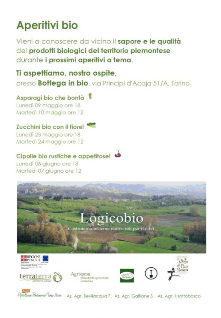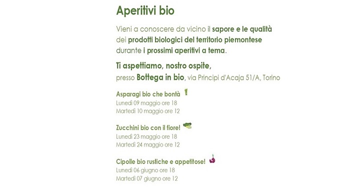 Vieni a conoscere da vicino il sapore e le qualità dei prodotti biologici del territorio piemontese durante i seguenti aperitivi a tema, presso Bottega in bio, Via Principi d’Acaja n. 51/a- Torino.